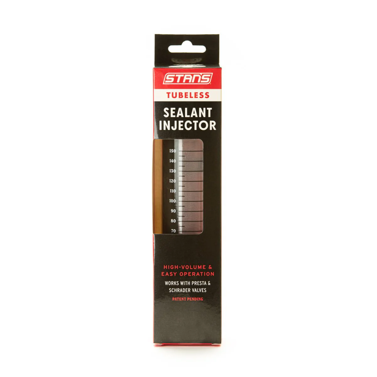 A patent pending system consisting of a unique air relief channel at the top of the injector body, paired with a cross-slit valve in the press-on adapter provides the user with a drip-free experience. For added convenience, this press-on adapter is compatible with both Presta and Schrader valves with no conversions or additional adapters necessary. In between uses, the branded hang plug provides clean storage on a workbench hook or inside a toolbox during travel.